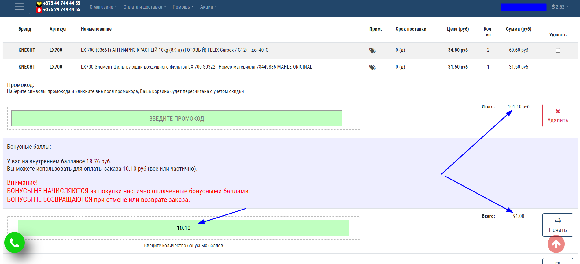 Бонусные баллы, которые Вы можете потратить при покупке, автоматически расчитываются в корзине и отображаются в соответствующем окне